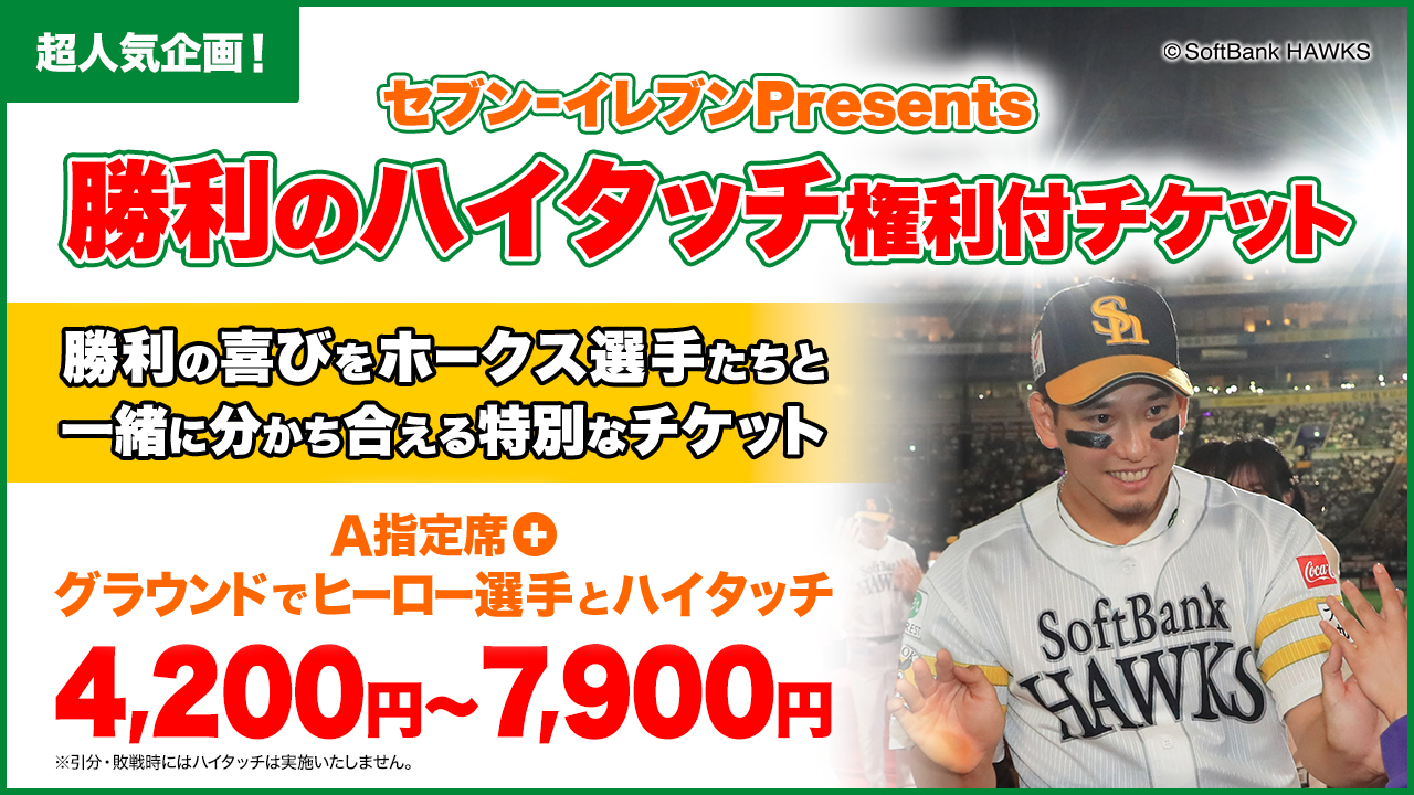 ホークスが勝利すればヒーロー選手とハイタッチできる超人気企画「セブン‐イレブンpresents 勝利のハイタッチ権利付チケット」♪各日限定60名、セブン-イレブン・セブンチケット限定での販売となります。ホークス選手と触れ合える、またとないチャンス♬