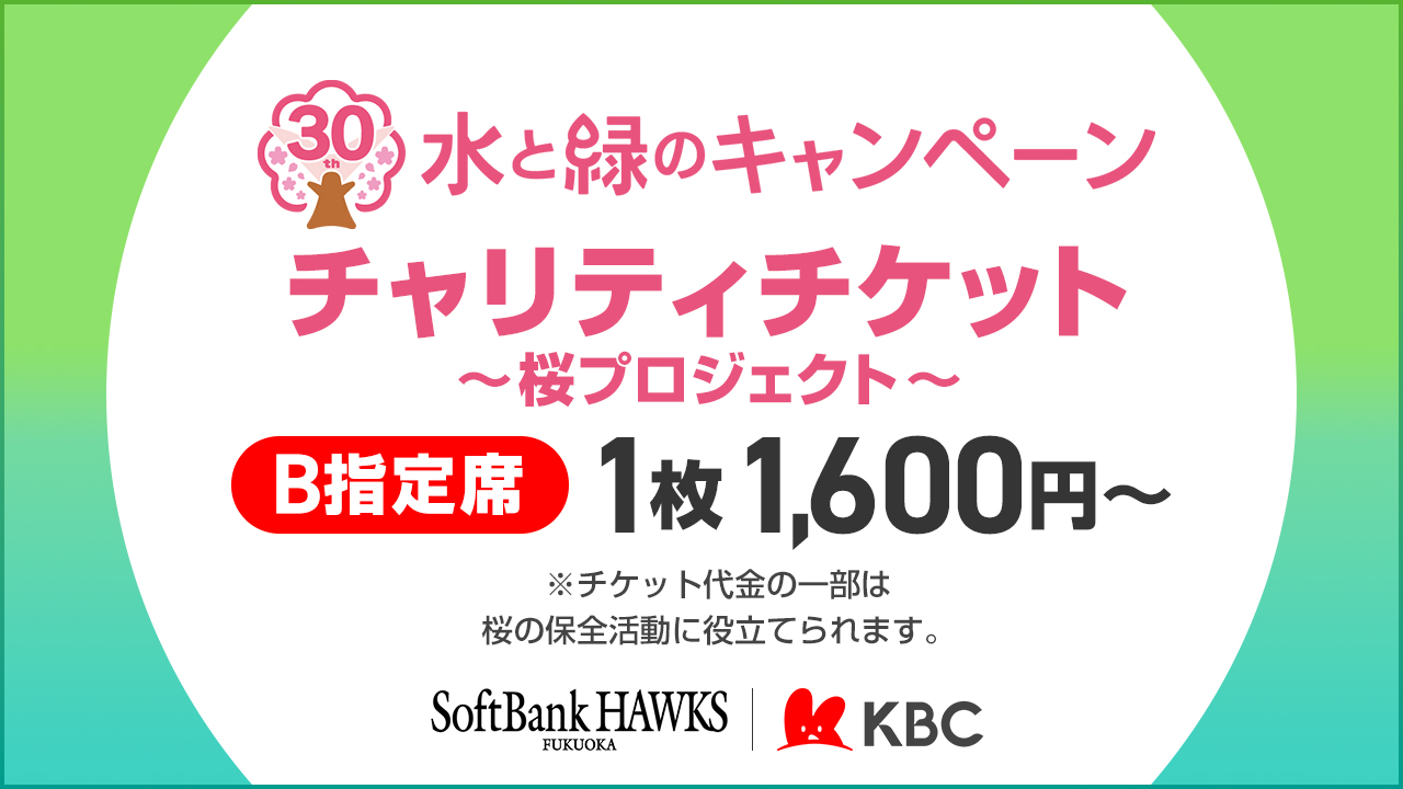 今年で30回目となる、KBC九州朝日放送「KBC水と緑のキャンペーン」のタイアップ企画として、4月5月の試合(弊社指定)が最大36%OFFで楽しめる、チャリティチケットを販売します。チケット代金の一部は桜の保全活動に役立てられます。数限定販売につきご購入はお早めに!