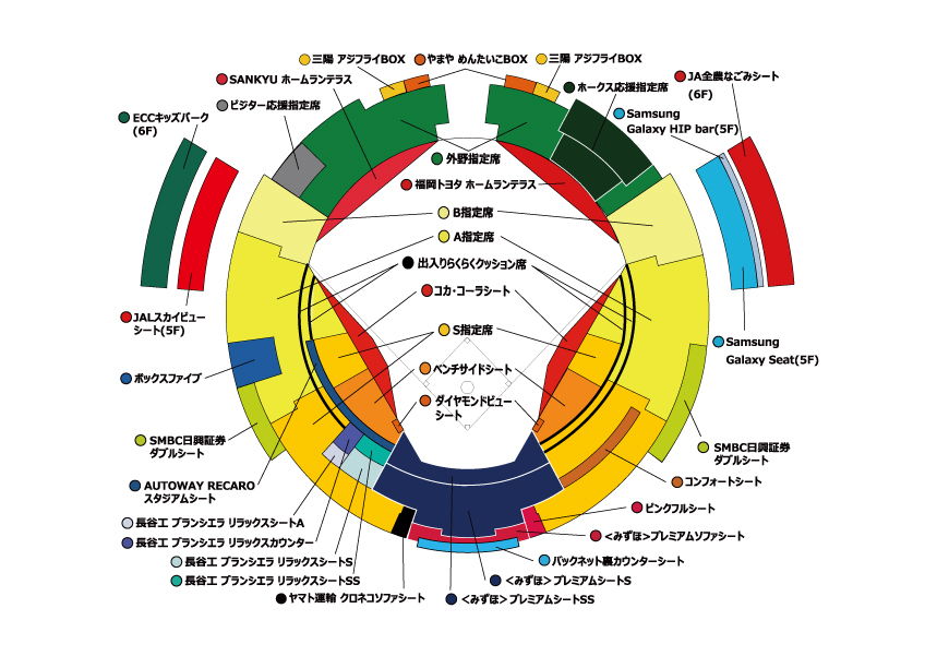 - 内野から外野に向けて順番に、S指定席・A指定席・B指定席エリアが分れています