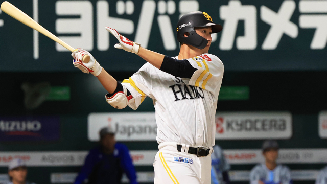 続く2戦目は2回2アウトで大貫投手のスライダーをライトのホームランテラス席へ運ぶ先制アーチ。待望の“ホークス1号”が決勝弾になりました。